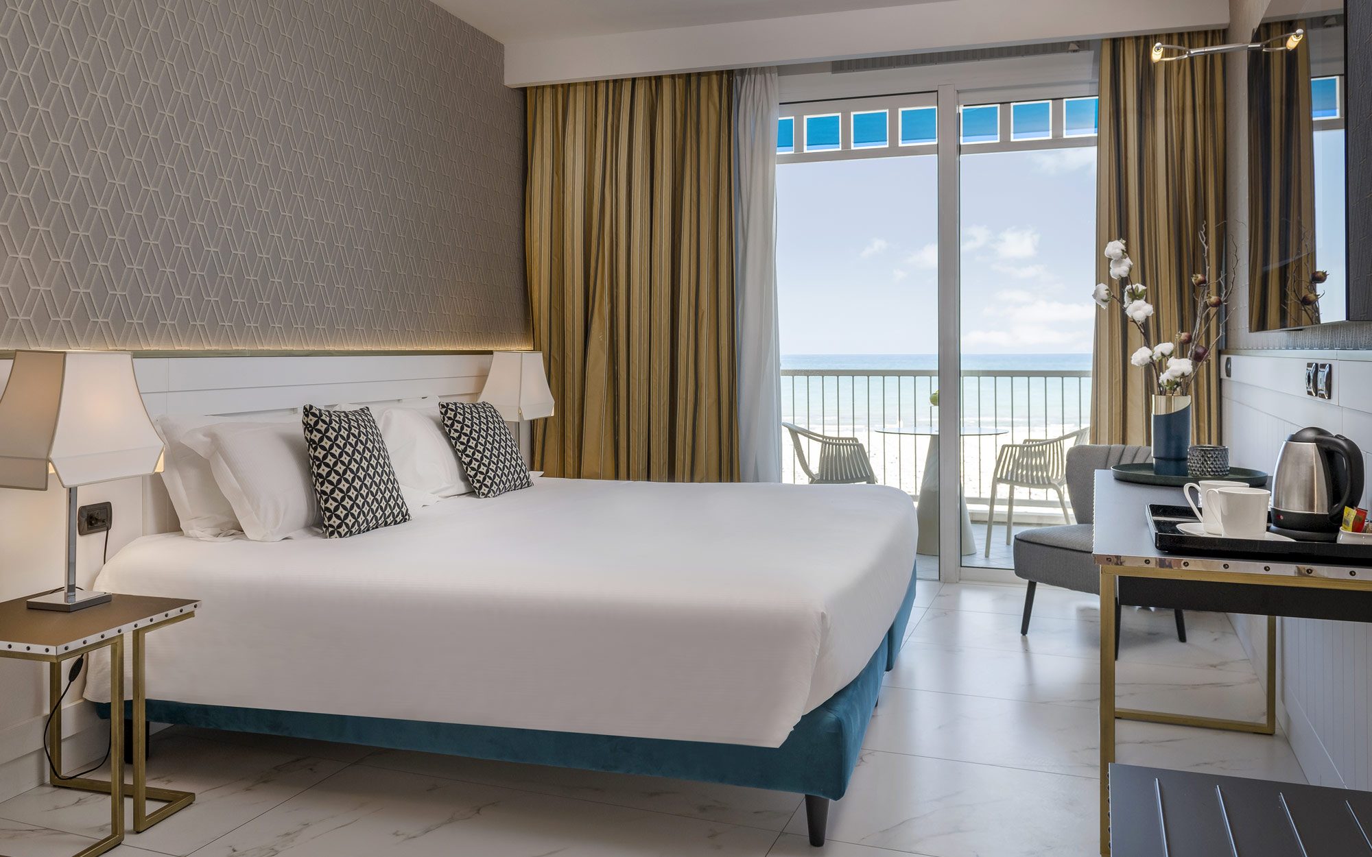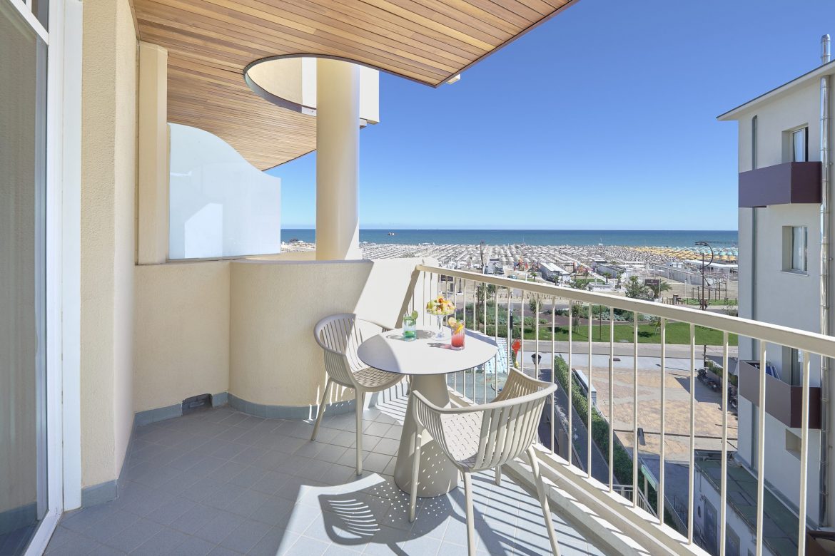 Sfrutta l’ampio balcone per i tuoi piacevoli momenti di relax, con il blu di fronte. Leggi un buon libro, bevi una bibita presa dal nostro frigo bar, goditi la tintarella di giorno o la vista delle stelle di notte.